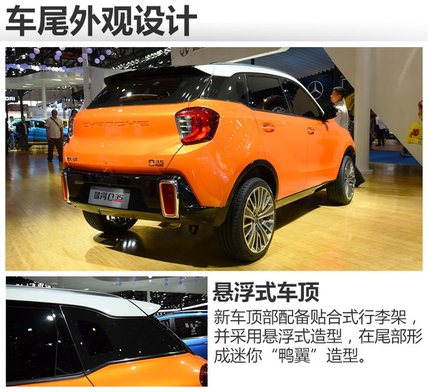 昌河Q35侧身配备双五辐造型的轮圈,延续整车时尚个性化设计风格。新车顶部配备行李架,并采用悬浮式造型,在尾部形成迷你“鸭翼”造型,这一设计与宝马i3尾部造型颇为相似。车尾整体设计较为简洁,昌河品牌拼音字母镶嵌其上,搭配两侧类似圆形的尾灯设计,下侧灯组则采用竖向设计与车头相呼应。