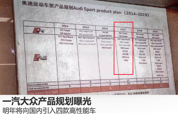在刚刚结束的Audi Sport嘉年华中,一汽-大众奥迪宣布Audi Sport子品牌正式成立。同时公布,未来5年内将向国内引入全系Audi Sport高性能车型。网通社根据一汽-大众奥迪此前曝光的产品规划了解到,截止到2019年将有9款RS系列车型引入国内,其中明年就有4款紧凑型的高性能车在华上市。Audi Sport子品牌的成立,进一步推动奥迪高性能车向国内引入的速度。