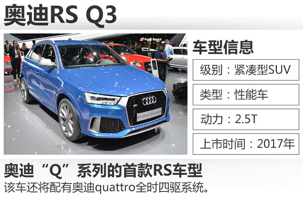 奥迪RS Q3在7月30日举办的Audi Sport嘉年华发布会上首次在华亮相,新车也是奥迪“Q”系列的首款RS车型,按照规划RS Q3将在明年正式引入国内市场销售。
