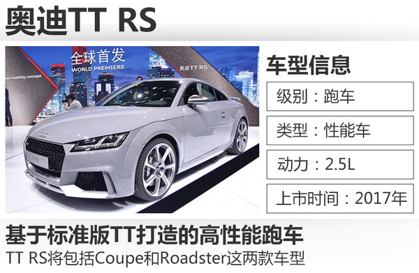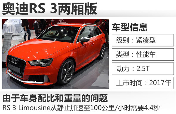 从这张截止到2019年的产品规划图中可以看到,在2017年(明年)的时候将有四款RS系列的“小刚炮”车型引入国内,其中包括RS Q3、RS 3 Sportback和RS 3 Limousine三款A级车,以及一款TT RS小型跑车。其中RS Q3和RS 3 Sportback在这次嘉年华活动中首次国内亮相。