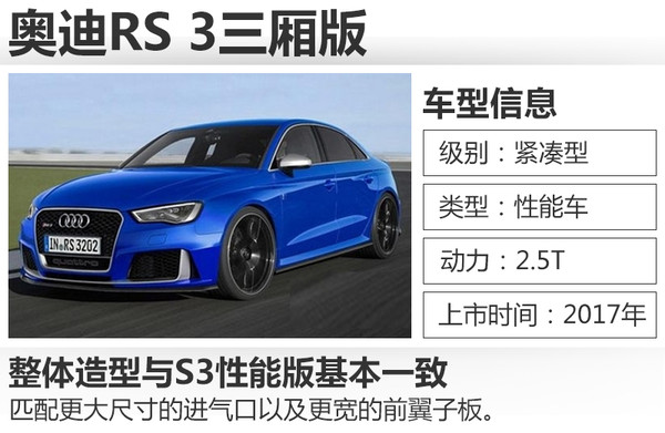 在明年引入国内的车型还包括奥迪RS 3 Sportback(两厢)和奥迪RS 3 Limousine(三厢)。Audi Sport嘉年华活动上仅带来RS 3 Sportback这款车型,更加张扬、激进的两厢车展示了“小钢炮“的运动气息。奥迪RS 3 Limousine目前还没亮相,不过从海外曝光的谍照图来看,整体造型与S3性能版基本一致,并匹配更大尺寸的进气口以及更宽的前翼子板。