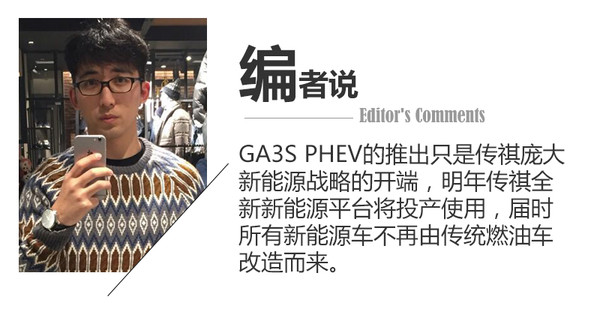 去年年底,广汽集团成立新能源分公司,全面加强新能源领域的战略布局。广汽集团副总经理、广汽乘用车董事长吴松曾表示:“广汽传祺将以插电式PHEV、纯电动EV作为发展重点、兼顾HEV混合动力,形成三大新能源车型平台和系列产品。”GA3S PHEV基于传统燃油版车型打造而来,是广汽传祺继GA5 PHEV之后,推出的第二款插电式混动车型。
