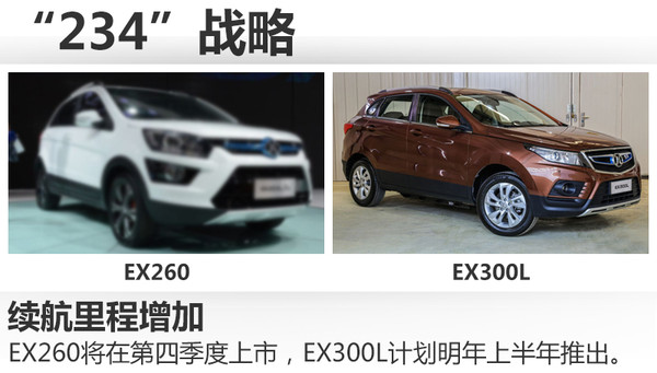 2014年,北汽新能源就已经确定了纯电动车“234”战略。计划在之后的三年中,每年将所有车型的续航里程进行提升,从200公里提高到300公里,再到400公里。纯电动小型SUV——EX200根据规划也将推出更多衍生车型。