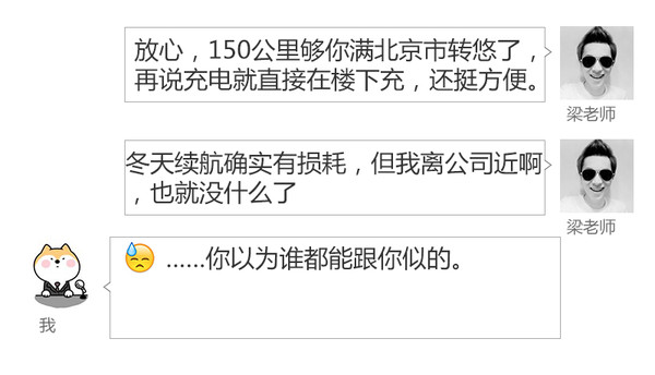 其实从简单的对话中便可以看出,纯电动车其实并没有网上疯传的那么鸡肋,在特定条件下还是蛮适用一些人群的。首先是那些苦于无车又摇不上号的,再者就是可以随时充电方便,第三就是车辆用途并不是太远,续航里程压力不大的人群。
