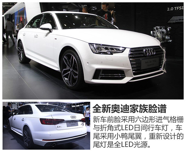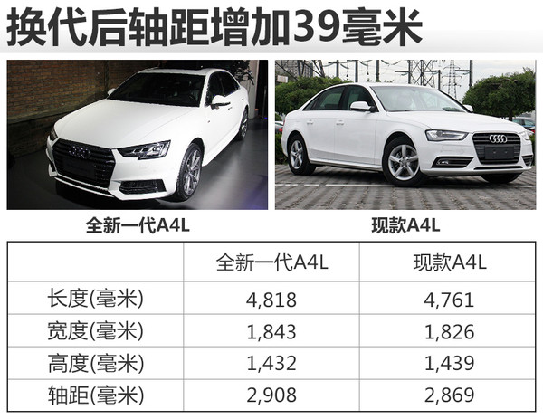 全新一代奥迪A4L采用最新的家族式外观设计,棱角更加分明。新车的车身尺寸长、宽、高分别为4,818*1,843*1,432毫米,轴距达到2,908毫米。相比海外版标准轴距车型,车身长度超出92毫米、轴距长出88毫米,同时相比现款B8车型车身尺寸同样有所增加。