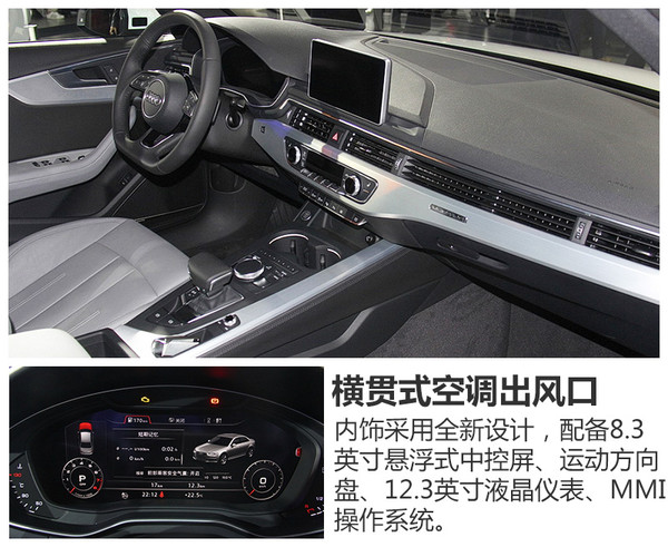 走进车内,全新一代奥迪A4L配备12.3英寸全液晶仪表盘,可显示包括信息娱乐、导航以及奥迪connect等界面。此外还有三区空调控制、MMI操作面板、三幅多功能运动方向盘、悬浮式8.3英寸的高分辨率中控彩色显示屏,并配有可手写输入的MMI触摸输入系统,操作更便捷。