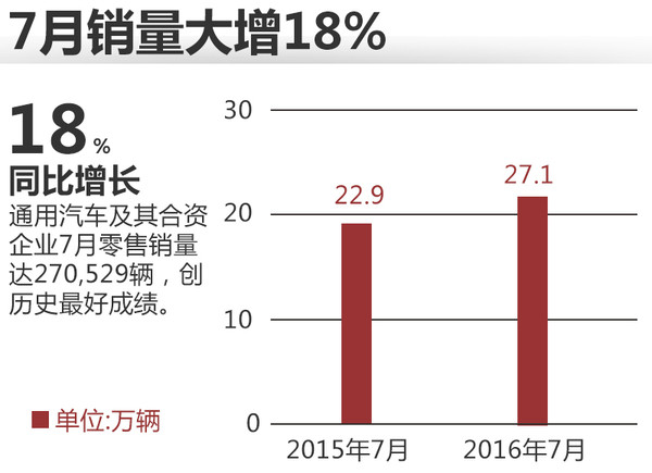 今年上半年,通用汽车在华零售销量突破180万辆,创造历史同期最好记录,而进入7月份这一良好销量势头还在继续。网通社从通用汽车官方获悉,通用汽车及其合资企业7月份在中国市场零售销量共计270,529辆,同比增长18%,前七个月,通用汽车在华累计销量超过200万辆,创历史同期销量纪录。