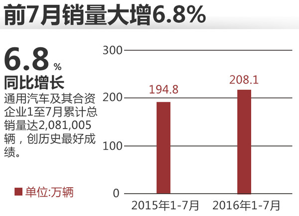 而1至7月累计总销量达2,081,005辆,相比去年同期的1,948,377辆增长6.8%,创造通用入华以来前七月最好销量成绩。