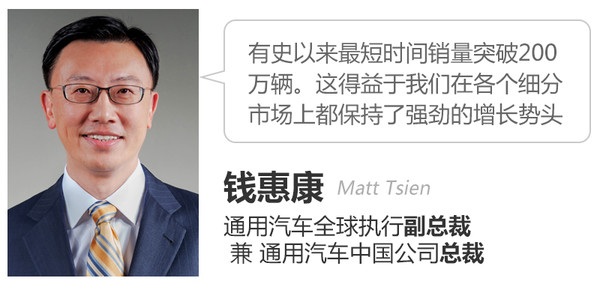 通用汽车全球执行副总裁兼通用汽车中国公司总裁钱惠康(Matt Tsien)先生表示:“今年,通用汽车及我们的合资企业在有史以来最短时间内成功实现了年内累计销量突破200万辆。这得益于我们在各个细分市场上都保持了强劲的增长势头。”