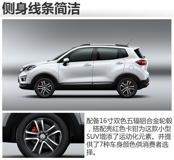 与现款相同,新车侧身线条简洁,配备16寸双色五辐铝合金轮毂,搭配亮红色卡钳为这款小型SUV增添运动化元素。