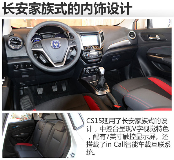 内饰方面,CS15 DCT版延用长安家族式的设计,中控台呈现V字视觉特色,配有7英寸触控显示屏。全景天窗是一大亮点,此外新车还配备发动机自动启停、无钥匙启动、以及定速巡航等配置。CS15 DCT版搭载in Call智能车载互联系统。这一系统配备高德导航、生活服务、WIFI通道、一键救援等功能,并支持百度Carlife互联系统。