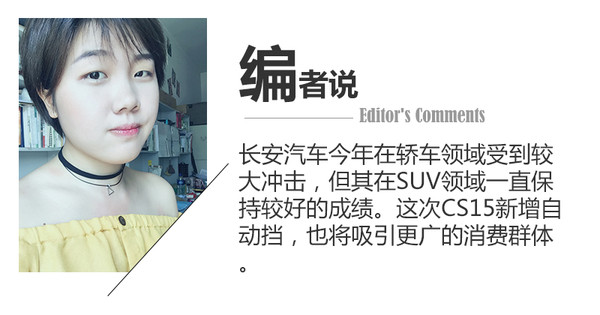 在长安汽车现有产品阵容中,轿车、SUV以及MPV的布局较为完善,这一优势从去年销量首破百万辆得以体现。在今年,四月上市的长安CS15这款小型SUV也贡献了不少的销量。网通社从长安汽车获悉:CS15自动档车型今日正式上市,售价7.29-7.79万。新车外观延续现款,传动系统将搭载双离合变速箱。