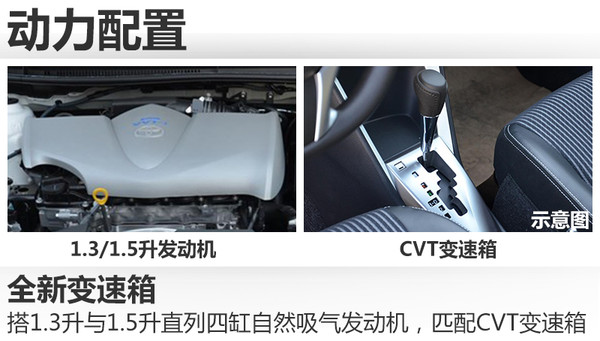 新款车型将沿用现款车型搭载的1.3升与1.5升直列四缸自然吸气发动机,采用全铝结构并采用双VVT-i可变气门正时等技术,最大功率分别为73千瓦与79千瓦。但与现款车型不同的是,在传动系统方面新车将为两台发动机匹配全新的CVT变速箱,用以取代现款车型搭载的4速自动变速箱。