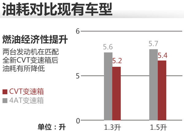 油耗方面,通过与现款搭载1.3升与1.5升发动机匹配4速自动变速箱车型相比,新车在最大功率上与现款车型保持一致,但得益于全新CVT变速箱的使用,燃油经济性表现得到提升,百公里综合油耗分别较现款车型低了0.4升与0.3升。