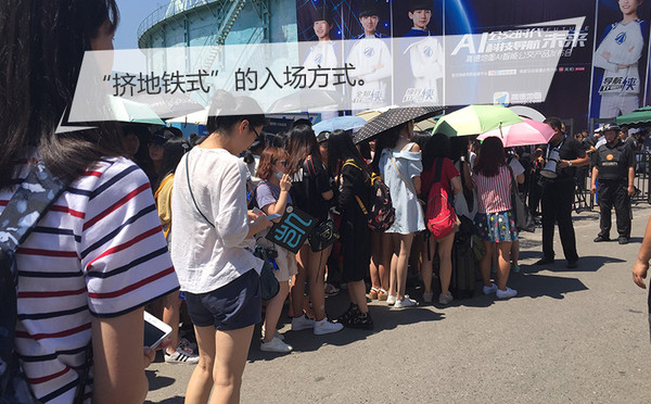 聊的差不多后,终于通知入场。小编第一次感受到“挤地铁式”的特殊入场方式。经过层层安检进到会场内,就已经看到拿着比媒体还专业的“长枪大炮”的粉丝们站着等待他们偶像的到来。现场的布局也处处体现产品信息。