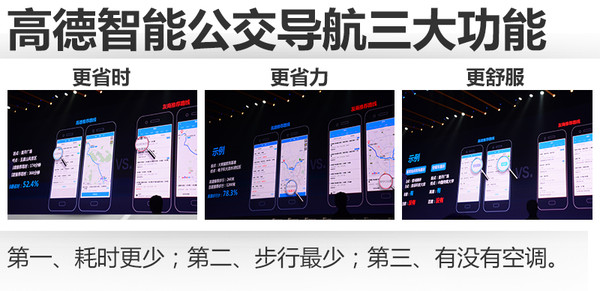 在产品讲解部分,高德地图副总裁董振宁使用了很多场景化和对比的描述,主要解析三类功能。第一、耗时更少;第二、步行最少;第三、有没有空调。这三大功能是此次产品的主要升级部分。也就是说用户可以通过高德智能公交导航查询一趟最快走路最少还必须有空调的公交。这就需要强大的数据及机器反馈的支持。