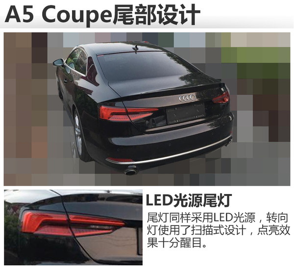 新车侧面的线条设计与上一代车型一致,侧腰线从后车窗的位置开始明显上扬,上翘的尾部设计迎合了A5 Coupe的轿跑风格,整体营造出更加年轻、动感的造型设计。而尾灯的造型也迎合了前大灯组样式,同样采用LED光源,转向灯使用了扫描式设计,点亮效果十分醒目。此外,尾排延续了现款车型所使用的双边单出设计。
