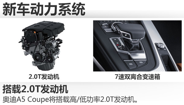动力方面,全新A5 Coupe有望提供高低功率两款2.0T发动机。其中,高功率版发动机的最大功率达210千瓦,低功率版发动机的最大功率为140千瓦。传动方面,新车匹配6速手动或7速S tronic双离合变速箱。