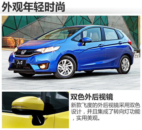 新款飞度采用本田家族式“Exciting H Design”设计理念,飞翼式进气格栅下方修饰有一条细长的镀铬条,显得十分灵动。车身侧面,锋利的双腰线延伸至尾灯,极具设计感。外后视镜采用双色设计,并且集成了转向灯功能,实用美观。