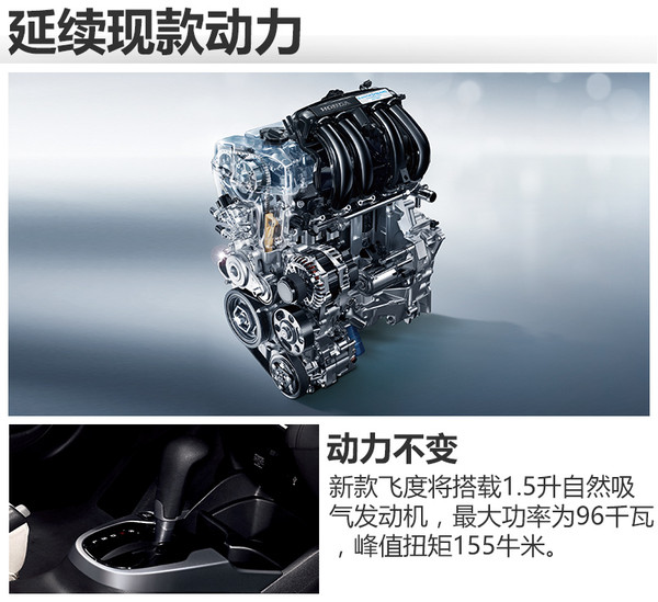 动力方面,新款飞度还将延续现款车型上的1.5升自然吸气发动机,最大功率为96千瓦,峰值扭矩155牛米。传动系统方面,与这款发动机匹配的是5速手动变速器和CVT变速器。安全配置方面,顶配车型上还具有车辆稳定性控制、斜坡起动辅助、紧急制动预警、三模式后视摄像显示等功能。