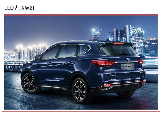 SEEK 5侧面线条立体感十足,侧窗周围及侧裙处均加入镀铬饰条点缀,整体更显精致感。新车尾部线条较为丰富,横置式LED尾灯向两侧延展,中间由镀铬饰条相连,整体拉伸横向视觉效果;该车底部带有大面积镀铬饰条,两侧雾灯下方双边共两出扁平排气装饰件的应用,富有运动气息。
