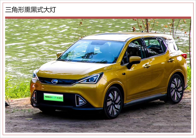 广汽新能源传祺GE3 530外观三角形大灯内部灯带与格栅底部饰条相连接,格栅中央放置了象征新能源的蓝色LOGO;前保险杠采用黑色材质,两侧三角形雾灯周围带有镀铬式条,配合底部蓝色装饰突显新能源身份;传祺GE3后方C柱采用黑色处理,营造出悬浮式效果。