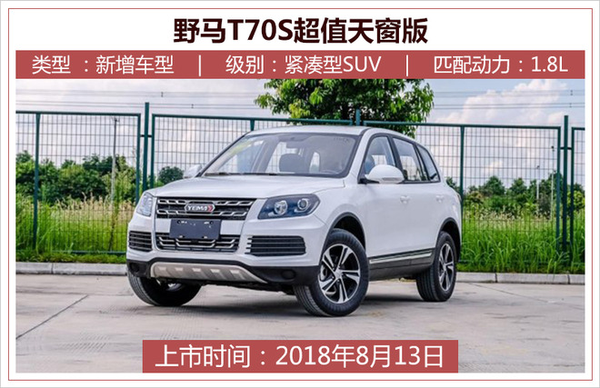 | 野马T70S超值天窗版 | 紧凑型SUV | 6.98 | 8月13日 |