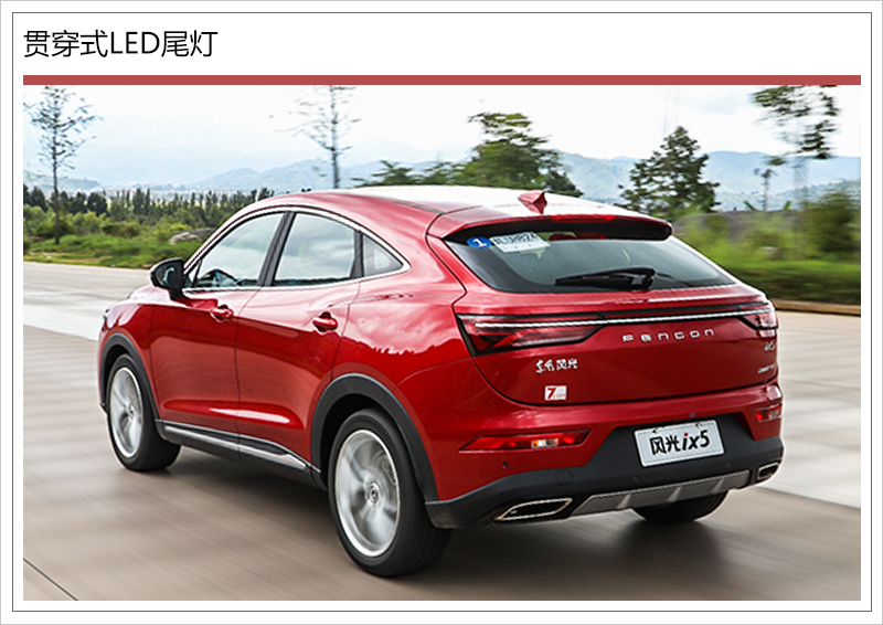新车采用溜背式造型设计,侧窗较为高挑并辅以银色镀铬饰条点缀,更显精致;风光ix5贯穿式尾灯中间由镀铬饰条贯穿,点亮效果十分醒目;这款SUV黑色保险杠底部带有银色护板,同时双边共两出矩形尾排的应用,彰显运动气息。此外,这款SUV将提供新车将提供星际蓝、鎏金黑、炫晶红、雪域白等多种颜色可选。
