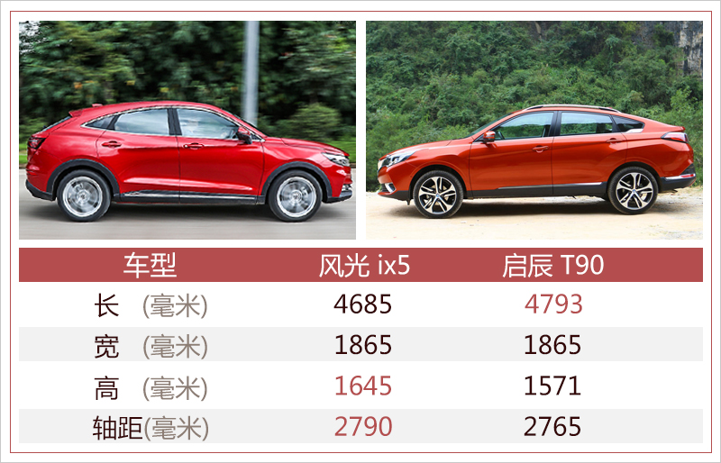 根据数据显示,风光ix5长宽高分别为4685*1865*1645毫米,轴距达到2790毫米;与同为轿跑SUV的启辰T90相比,新车宽度与后者持平,高度和轴距均占有优势。